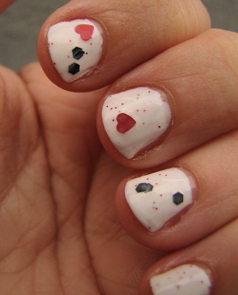 Also using white as the base means you can't see the white bar glitter or the clear hearts. They are both there. In fact you can't see it probably but there is even a clear heart on one of these finger. Its like where's waldo for nail polish. :-P